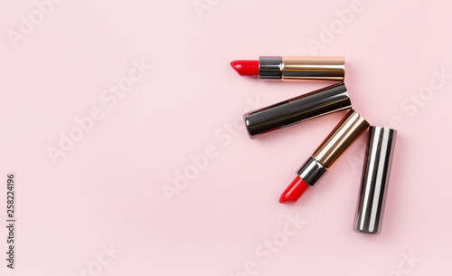 set of lipstick, lip gloss on pink background. Woman's cosmetics. Women's morning secrets. Cosmetics, lipstick. Make up collection