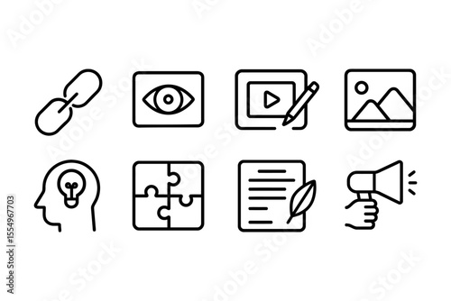 icon, minimalist, media, communication, concept, line, minimal, link, eye, video, document, puzzle, brain, idea, megaphone, connection, view, edit, image, head, creativity, analysis, piece, writing, leaf, announcement, speak, illustrate, modern, outline, network, visual, interaction