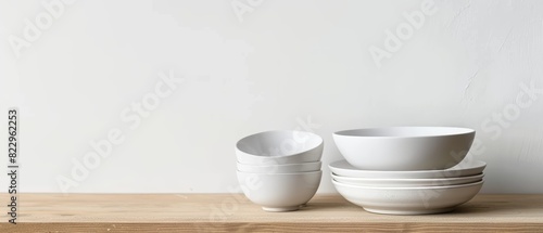 Set of minimalist white bowls and plates on a wooden table, isolated on a white background, clean design