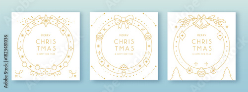 Set of modern Christmas frames or holiday greeting cards on white background. Line art vector illustration