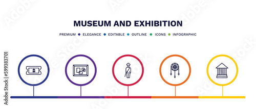 set of museum and exhibition thin line icons. museum and exhibition outline icons with infographic template. linear icons such as museum ticket, pop art, security guard, dreamcatcher, modern art