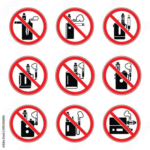 Set of nine prohibition signs for vaping devices and e cigarettes