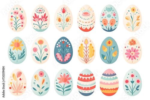set of Pastel Easter egg assortment with playful nature floral patterns, spring holiday themes and craft inspiration