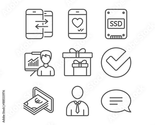 Set of Phone communication, Presentation and Verify icons. Love chat, Delivery boxes and Cash signs. Human, Ssd and Chat symbols. Incoming and outgoing calls. Education board. Selected choice. Vector