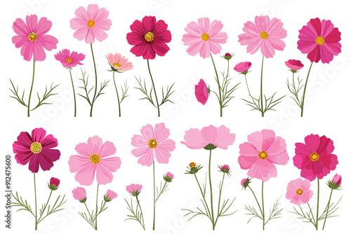 Set of pink cosmos flowers, Set of cosmos flower collection, Beautiful cosmos flower, Decorative floral design elements, Pink and red cosmos flowers on white background