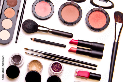 Set of professional cosmetic: make-up brushes, shadows, lipstick, nail polishes - partly isolated with shadows on white background. Overhead view. Front part. Place for your text.