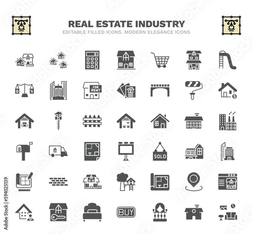 set of real estate industry filled icons. real estate industry glyph icons such as houses, calculate, shopping, paint roll, storehouse, moving truck, office building, blueprint, bedroom vector.