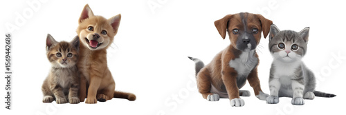 Set of realistic 3D puppies and kittens in cute poses isolated on transparent background