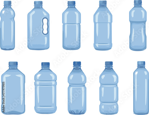 Set of realistic plastic water bottles with different shapes and caps isolated on white background for packaging and product design