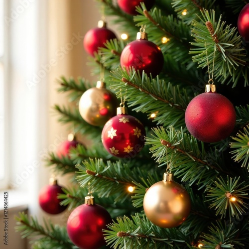 Set of red and gold Christmas tree baubles, close-up view, color, image, sphere