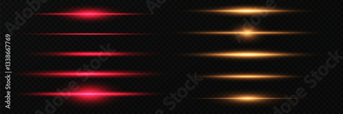 Set of red and yellow horizontal light lines. Set of light flashes with rays, on transparent background.
