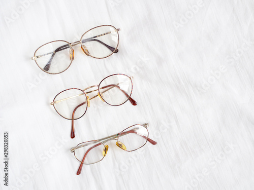 Set of retro eyeglasses isolated on white linen background. Flat lay. Top view. Copy space