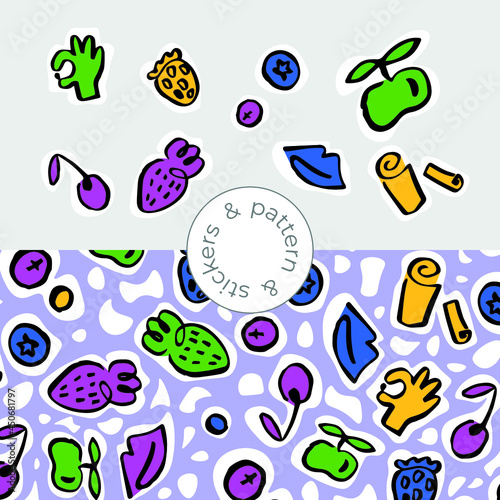 Set of Seamless Vector Hand-drawn Summer Fruit Patterns and stickers