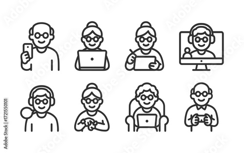 senior, elderly, old, people, person, man, woman, grandmother, grandfather, laptop, computer, tablet, smartphone, phone, screen, monitor, headset, online, cyberspace, digital, technology, video, call, chat, communication, gaming, controller, play, knit up, hobby, lifestyle, relax, sitting, chair, work, learning, education, modern, activity, icon, outline, vector, black, white, line, design, illustration, sticker, card