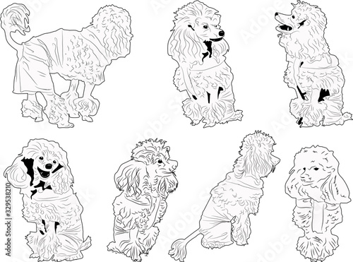 set of seven poodles outlines isolated on white