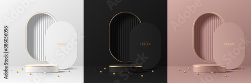 Set of silver, black, gold, pinkgold 3d cylindrical podium background with round window luxury wall scene. Abstract minimal mockup Product display presentation, Stage showcase. Platforms vector design