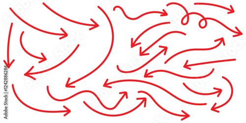 Set of simple lines hand drawn red arrows in various style. Set of simple of hand drawn red arrows. Set of simple lines hand drawn red arrows. Various of simple lines arrows collection