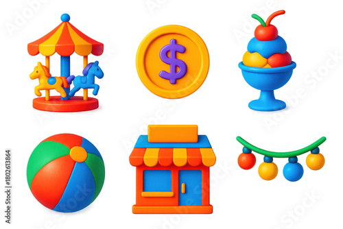 Set of six cartoon images of various toys and a store