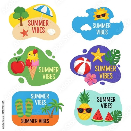 Set of Six Playful “Summer Vibes” Cartoon Illustrations Featuring Icons Like Pineapple, Ice Cream, Beach Items, and Palm Trees