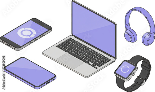 laptop, computer, notebook, technology, business, cyberspace, keyboard, screen, mobile, communication, illustration, phone, object, display, information, office, smart, watch, earphones