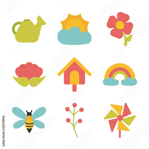 spring, sun, nature, flower, green, leaf, butterfly, insect, animal, season, floral, love, germinating, grass, romance, freshness, garden, collection, bundle, gardening, vector, illustration, flower, easter, plant, life, growth, march, april, may, watering, decoration, sticker, design, graphic, cartoon, background, flat, icon, isolated