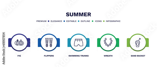 set of summer thin line icons. summer outline icons with infographic template. linear icons such as fig, flippers, swimming trunks, wreath, sand bucket vector.