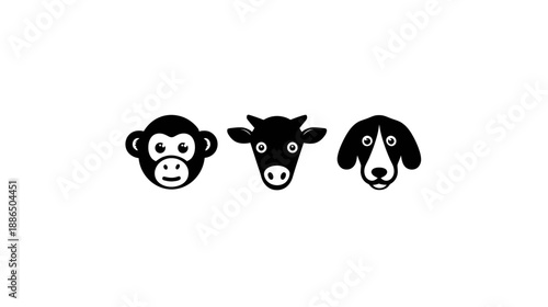 vector, illustration, monkey, cow, dog, face, collection, simple, black-and-white, minimal, cute, cartoon, pictogram, silhouette, design element, isolated, avatar, symbol, modern, wildlife, domestic animals, farm animal, pet, mammal, variety, graphic design, animal kingdom, stylised, clean, outline, head shot, character, diverse, representation