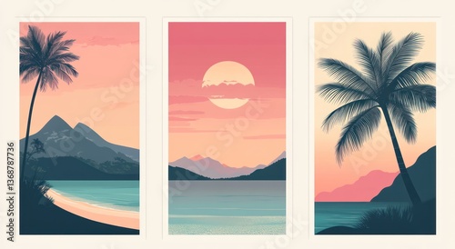 Set of three vector illustrations, beach landscape, sea and mountain view, palm tree, sunset