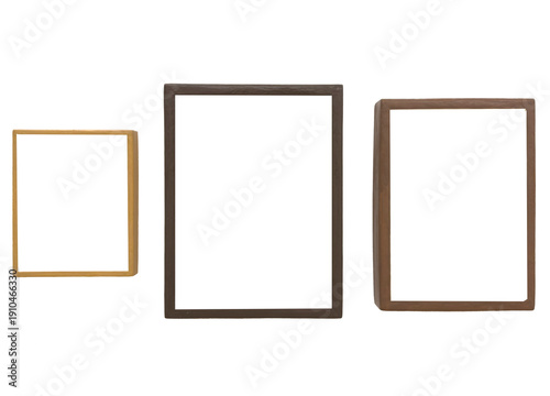 frame, picture, isolated, white, cut-out, wooden, wood, brown, rectangle, vertical, border, blank, empty, copy space, template, design, decor, decoration, minimal, modern, gallery, exhibition, display, mount, clean, simple, object, studio, background, clipping, path, print, poster, canvas, presentation, branding, art, contemporary, classic, elegant, neutral, collection, set, trio, portrait, arrangement, three
