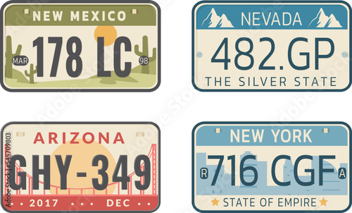 us, licence, plate, number, state, registration, car, signs, vehicle, vector, auto, american, transport, illustration, america, metal, automobile, set, country, information, drive, retro, traffic, vintage, symbol, tags, travel, text, united, road, different, arizona, new york city, michigan, nevada, california, oregon, hawaii, style, shape, object, label, transportation, identification, name, signboard, card, frame