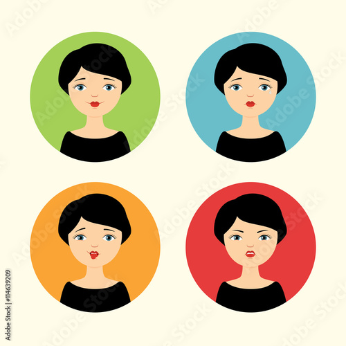 vector, illustration, avatar, portrait, people, woman, girl, lady, female, set, flat, icon, human, person, cartoon, 4, pretty, beautiful, stylish, young, brunette, french, european, caucasian, different, emotion, smiling, calm, cute, crying, sad, angry, disdain, fun, mocking, teasing, grimace, cheerful, nice, character, evil, contempt, tongue, facial expression, option, circle