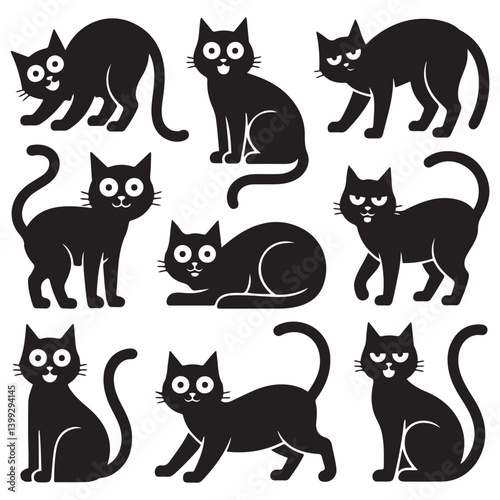 Set of Vector Black silhouettes cats. Collection of funny cats in different poses. illustration isolated on white background. Drawing with children.