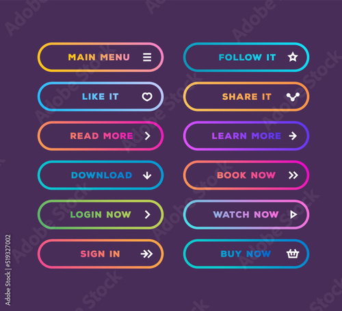 Set of vector button modern gradient line style with user interface icons isolated on background for web site, ui, mobile app. Call to action icon button. 10 eps