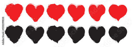 Set of vector hearts. Grunge hearts icons. Scribble ink red and black grunge heart shapes. Hearts icons set hand draw with markers. Art & Illustration