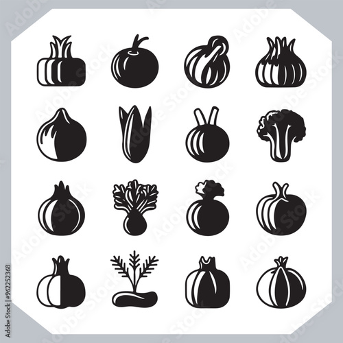 Set of vegetables black silhouette Carrot, potato, tomato, cucumber, onion, garlic, cauliflower, bell pepper, cabbage vector icon in white background.