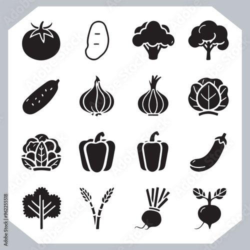Set of vegetables black silhouette Carrot, potato, tomato, cucumber, onion, garlic, cauliflower, bell pepper, cabbage vector icon in white background.