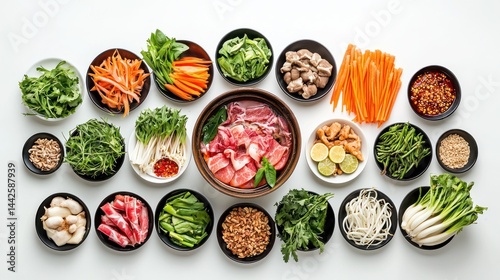 Set of Vietnamese hotpot ingredients arranged around a central pot on white background.