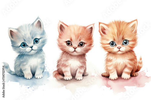 Set of watercolor fluffy kittens on white background