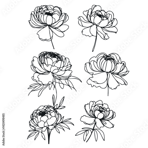 Set outline peony spring, doodle Collection floral stems. Hand drawn Botanical drawing. Detailed line art peonies illustration. Simple Stylized anemone flowers. Black and White blossom sketch