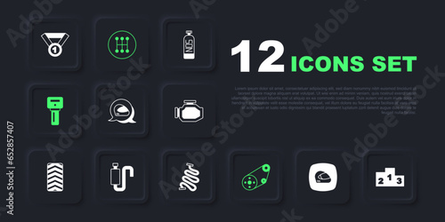 Set Racing helmet, Award over sports winner podium, Timing belt kit, Car key with remote, muffler, Gear shifter and track icon. Vector
