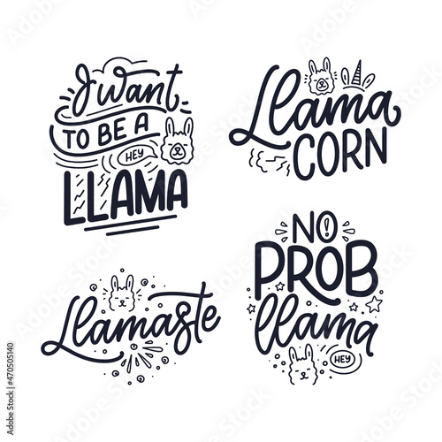 Set with funny hand drawn lettering quotes about llama. Cool phrases for print and poster design. Inspirational kids slogans. Greeting card template. Vector