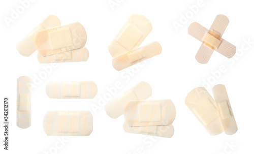 protection, fix, emergency, elastic, top, view, help, bandage, antibacterial, medic, antiseptic, wound, heal, prevent, injury, clinic, adhesive, doctor, sick, disease, ill, hospital, fabric, body, treatment, therapy, skin, medicine, care, patch, health, protect, material, medicals, aid, first, item, sticking, in plaster, isolated, white, object, background, collage, different, set, many, collection
