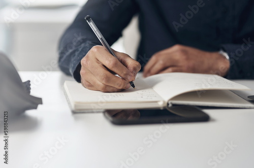 Setting deadlines for myself and my goals. an unrecognizable businessman sitting alone in his office and writing notes in a notebook.