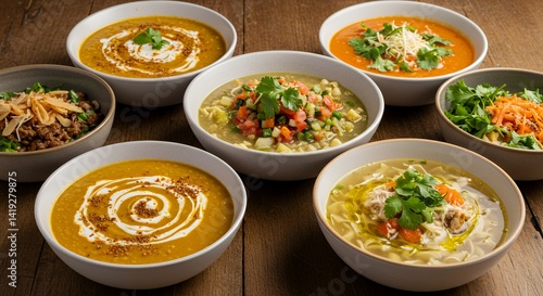 Seven Bowls of Diversely Garnished Soups on Rustic Wooden Table
