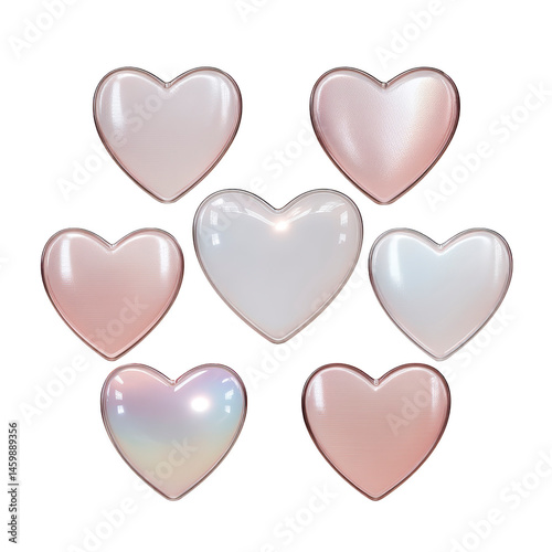 Seven glossy, pastel colored heart shapes are arranged in pattern, featuring soft, iridescent sheen. hearts vary in shades of pink, white, and pearl, creating delicate and romantic aesthetic