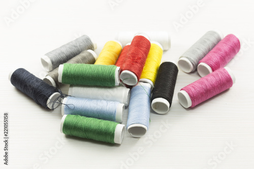 background, white, thread, closeup, colourful, clothing, textile, craft, fiber, cotton, sewing, reel, sew, needlecraft, spool, bobbin, several, blue, colours, red, yellow, fashion, bright, orange