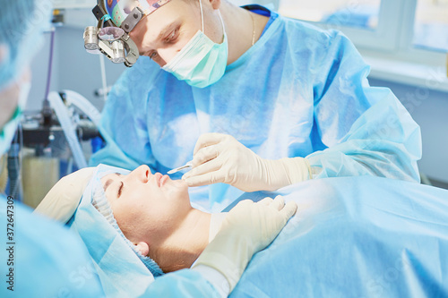 Several doctors surrounding patient on operation table during their work. Team surgeons at work in operating room