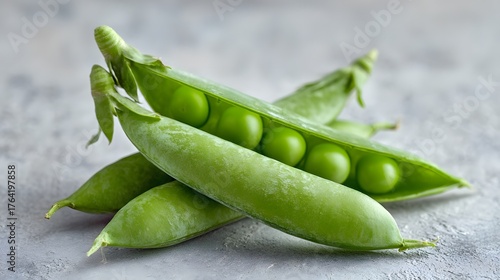 Several fresh green pea pods resting on a textured gray surface with one pod opened to reveal round seeds