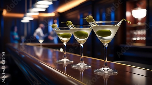 Several glasses of famous cocktail martini shot at a bar with shallow depth of field