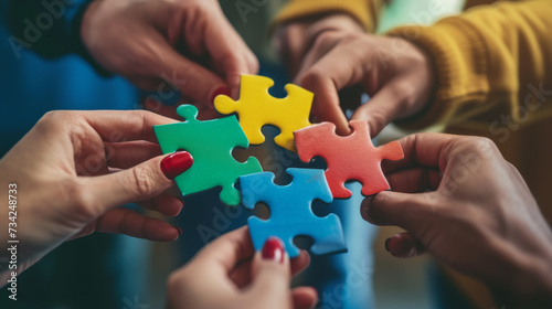 several hands of diverse people coming together to connect pieces of a multicolored jigsaw puzzle, symbolizing teamwork and collaboration.